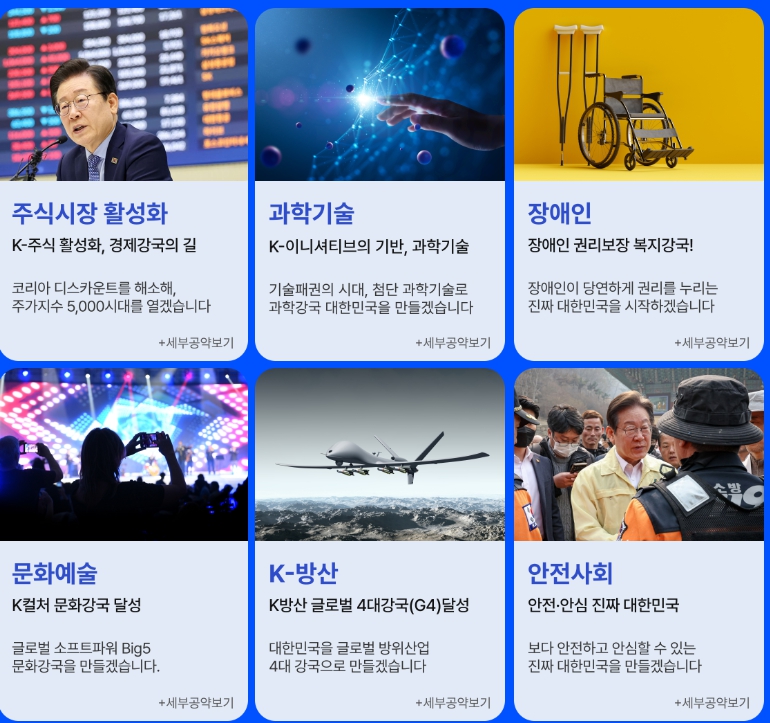 이재명 후보는 공약 전반에서 '실용정치'를 강조합니다. 청년, 복지, 노동, 정치개혁뿐만 아니라 주식·부동산·소상공인 등 실생활과 밀접한 공약도 세밀히 설계되어 있습니다.