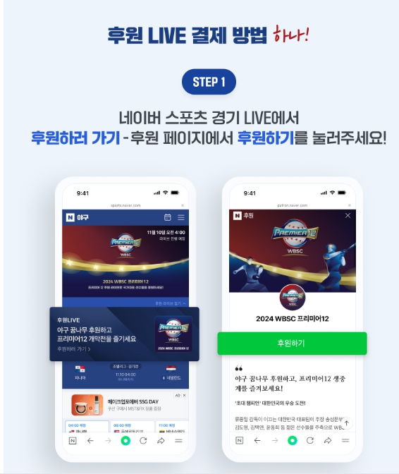 네이버 스포츠 경기 live에서 후원하러가기 - 후원 페이지에서 후원하기를 눌러주세요